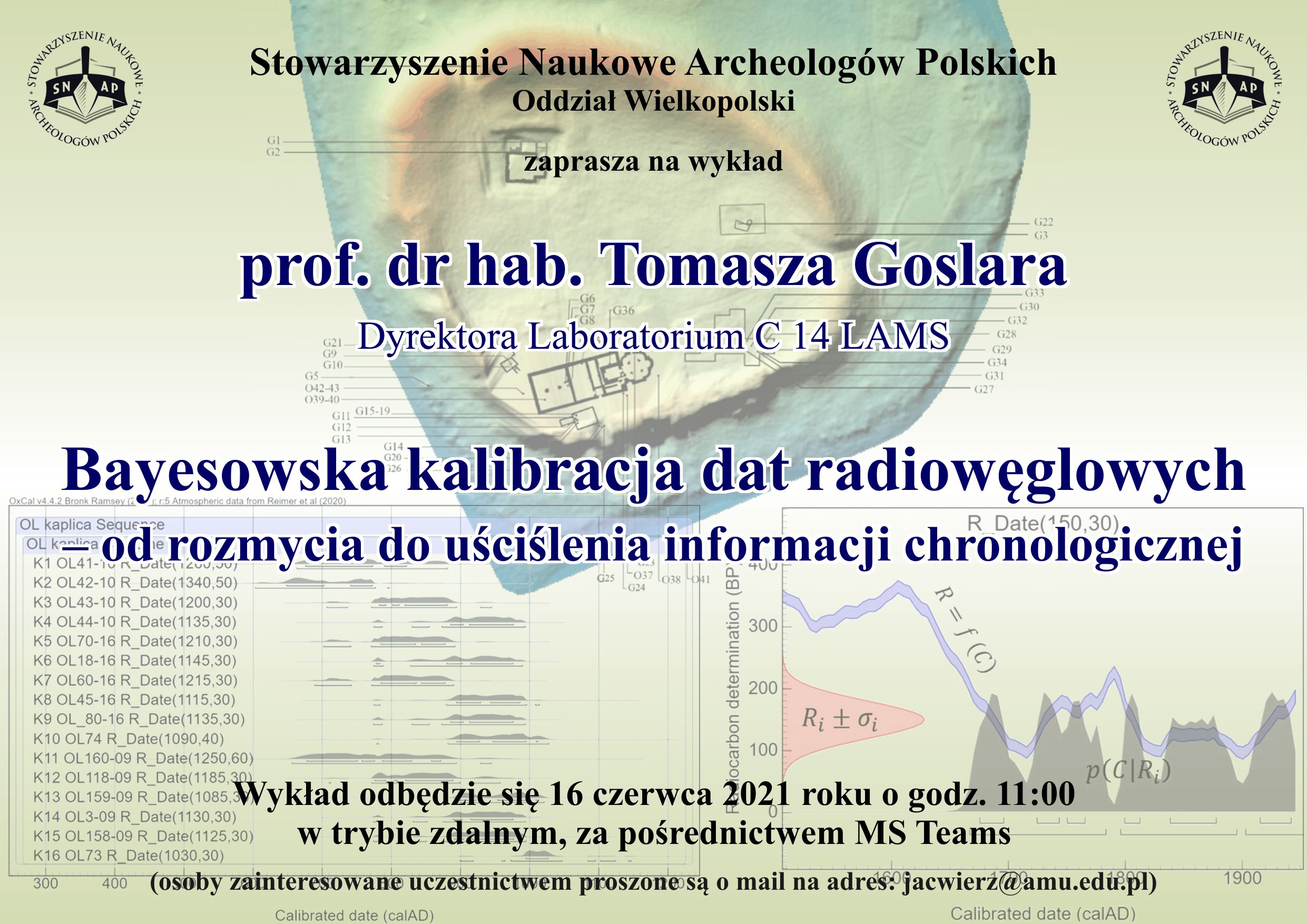 Zapraszamy na wykład prof. dr hab. Tomasza Goslara, Dyrektora Laboratorium C14 LAMS w Poznaniu, zatytułowany „Bayesowska kalibracja dat radiowęglowych — od rozmycia do uściślenia informacji chronologicznej”. Wykład odbędzie się 16 czerwca (środa) 2021 roku, o godz. 11:00, w trybie zdalnym za pośrednictwem MS Teams (można będzie go wysłuchać korzystając z przeglądarki internetowej albo aplikacji zainstalowanej na lokalnym komputerze, czy nawet na smartfonie). Osoby zainteresowane udziałem w wykładzie proszone są o przesłanie maila na adres jacwierz@amu.edu.pl. 19 maja 2021 roku zmarła mgr Mirosława Dernoga, wieloletni pracownik wielkopolskich służb konserwatorskich i członek naszego oddziału SNAP od 1990 roku. Cześć Jej pamięci! Pogrzeb odbędzie się na cmentarzu w Pile przy ul. Motylewskiej w najbliższą sobotę, 22 maja, o godz. 12:00. ![]()