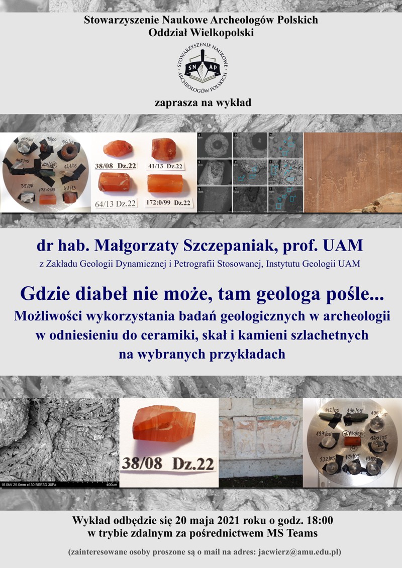Zapraszamy na wykład prof. UAM dr hab. Małgorzaty Szczepaniak z Zakładu Geologii Dynamicznej i Petrografii Stosowanej Instytutu Geologii UAM zatytułowany „Gdzie diabeł nie może, tam geologa pośle... Możliwości wykorzystania badań geologicznych w archeologii w odniesieniu do ceramiki, skał i kamieni szlachetnych na wybranych przykładach”. Wykład odbędzie się 20 maja (czwartek) 2021 roku, o godz. 18:00, w trybie zdalnym za pośrednictwem MS Teams (można będzie go wysłuchać korzystając z przeglądarki internetowej albo aplikacji zainstalowanej na lokalnym komputerze, czy nawet na smartfonie). Osoby zainteresowane udziałem w wykładzie proszone są o przesłanie maila na adres jacwierz@amu.edu.pl. Zarząd Główny Stowarzyszenia Naukowego Archeologów Polskich ogłosił XX edycję (za 2020 rok) Nagrody im. Krzysztofa Dąbrowskiego. Serdecznie zapraszamy wszystkich archeologów oraz wszelkie instytucje i organizacje archeologiczne do zastanowienia się nad kandydatami do tej Nagrody i do złożenia odpowiednich wniosków do 30 kwietnia 2021 roku na adres Zarządu Głównego SNAP (ul. Uniwersytetu Poznańskiego 7, 61-614 Poznań) lub e-mailem na adres: snap@snap.org.pl lub jacwierz@amu.edu.pl. Czytaj więcej >>4 marca 2021 roku Oddział Wielkopolski SNAP wzbogacił się o dwóch członków. Zarząd Główny zaakceptował kandydatury dr Olgi Antowskiej-Gorączniak z Wydziału Archeologii UAM i prof. dr hab. Przemysława Niedzielskiego z Zakładu Chemii Analitycznej UAM. Nowym członkom naszego Oddziału gratulujemy!